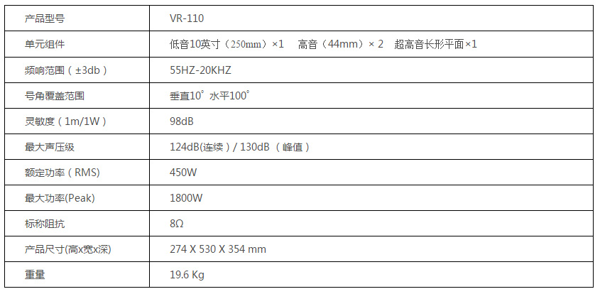 VR110全頻箱配置的是1個10寸紙盆釹磁低音揚聲器和2個1寸高音驅動器。裝于10寸箱體前部的壓縮腔相位塞(compression chamber phase plug) 防止低頻段由于梳狀濾波產生干涉, 化了低頻指向性。結合在兩個高音驅動器和1個超高音驅動器間經過耦合的優(yōu)化波形生成器,形成一個10°的垂直波面,生成非常厚實的低頻和明亮的高音。