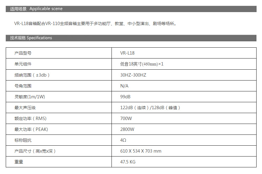 VR-L18低音音箱給VR-110線陣列系統(tǒng)帶來了新的功能,以較低的成本提供高的SPL。這款單15英寸的長(zhǎng)橫程低音揚(yáng)聲器可以與VR-110線陣列模塊一起吊裝使用,或者與VR-110箱體一起進(jìn)行地板堆疊安裝。
