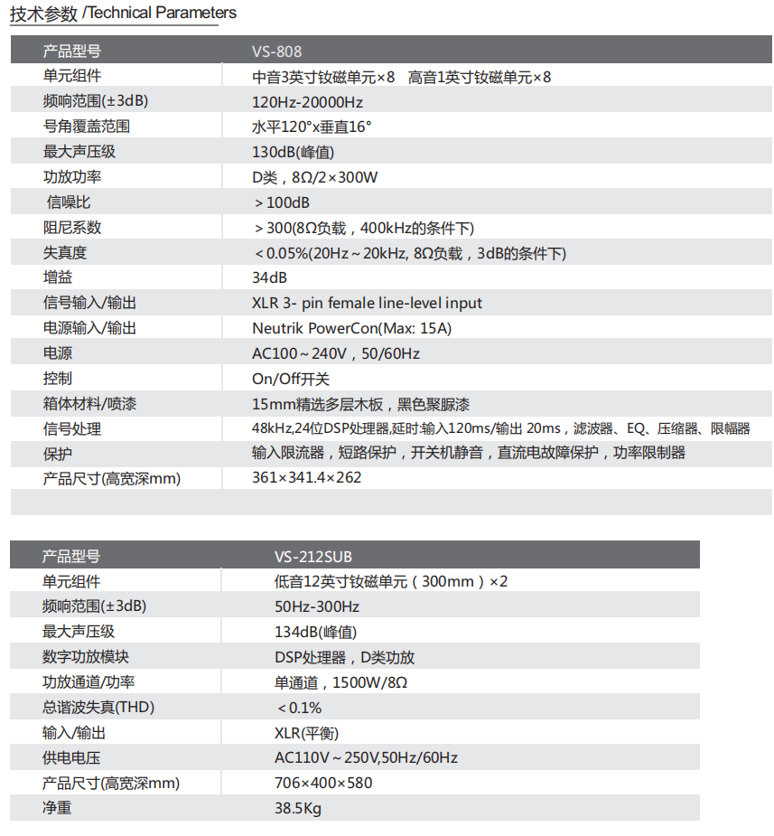 特色:VS-808采用8個(gè)3″*率釹磁中音揚(yáng)聲器和8個(gè)1″直接輻射釹磁高音揚(yáng)聲器; 所有單元選自意大利Lavoce品牌單元,中頻效率高,能量足,聲音通透,高頻清晰明亮。
